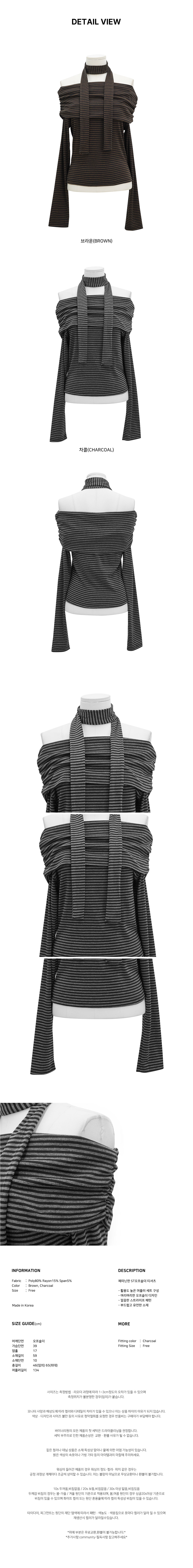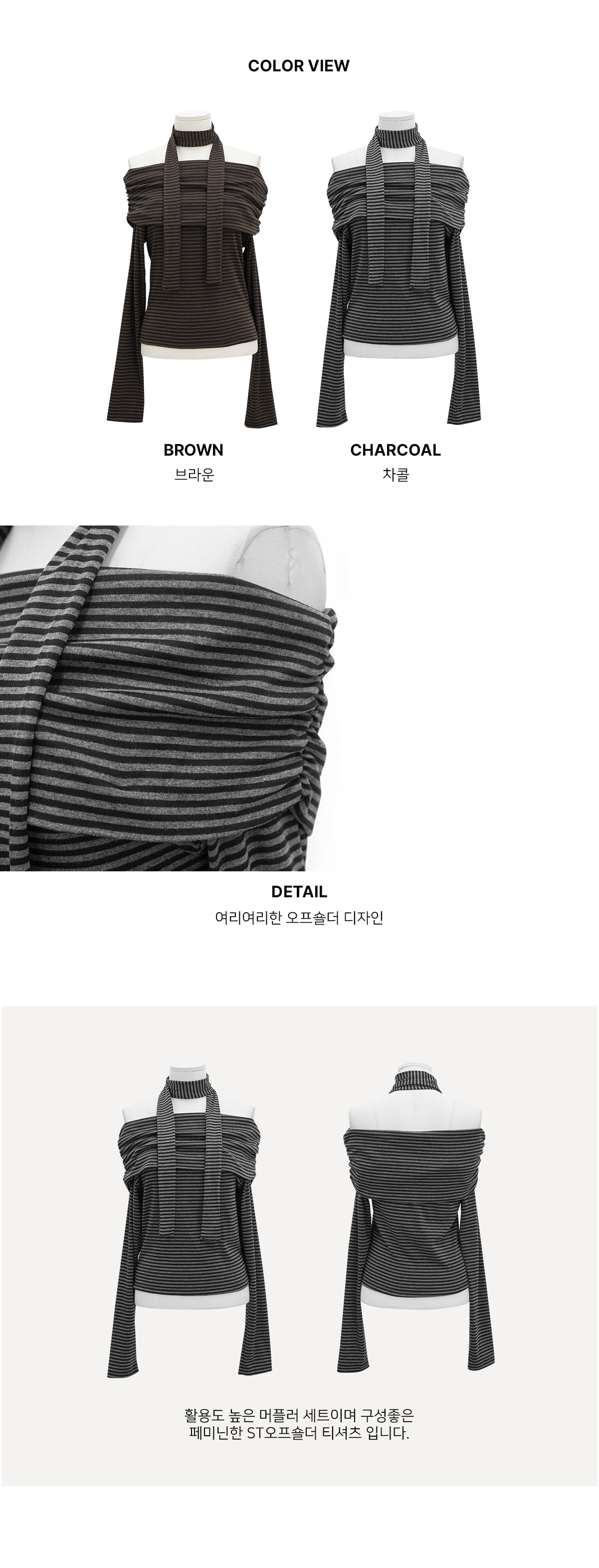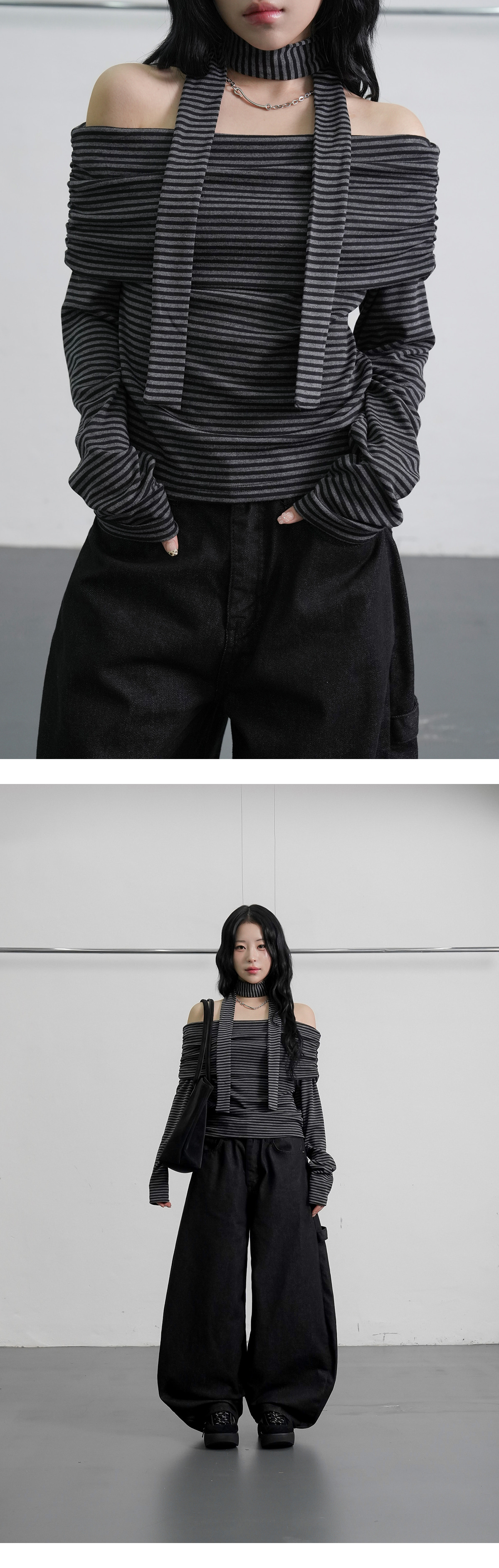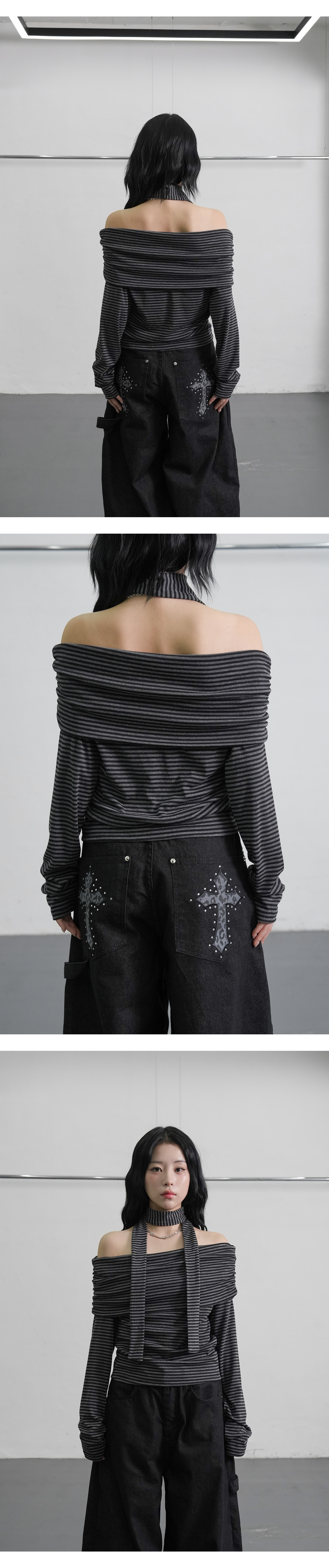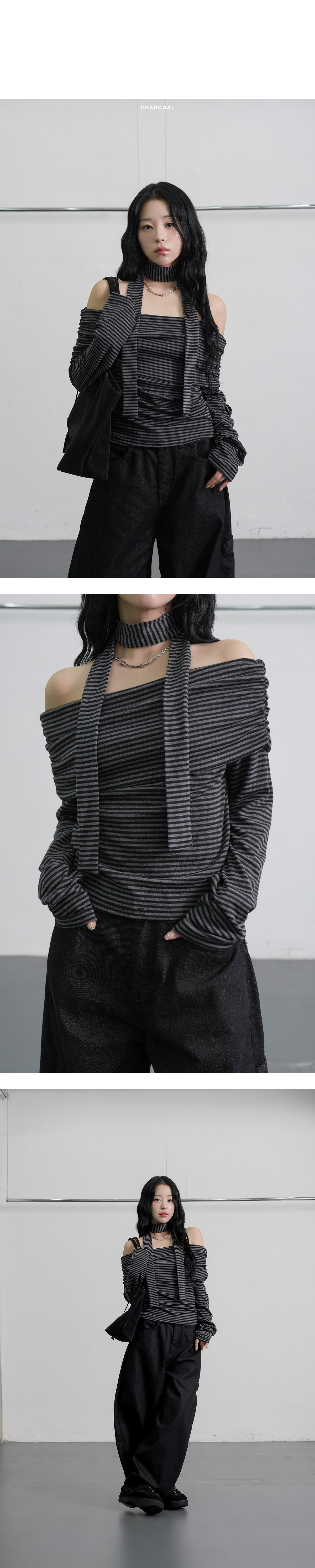[圍巾套裝] 條紋細節 露肩 T恤
